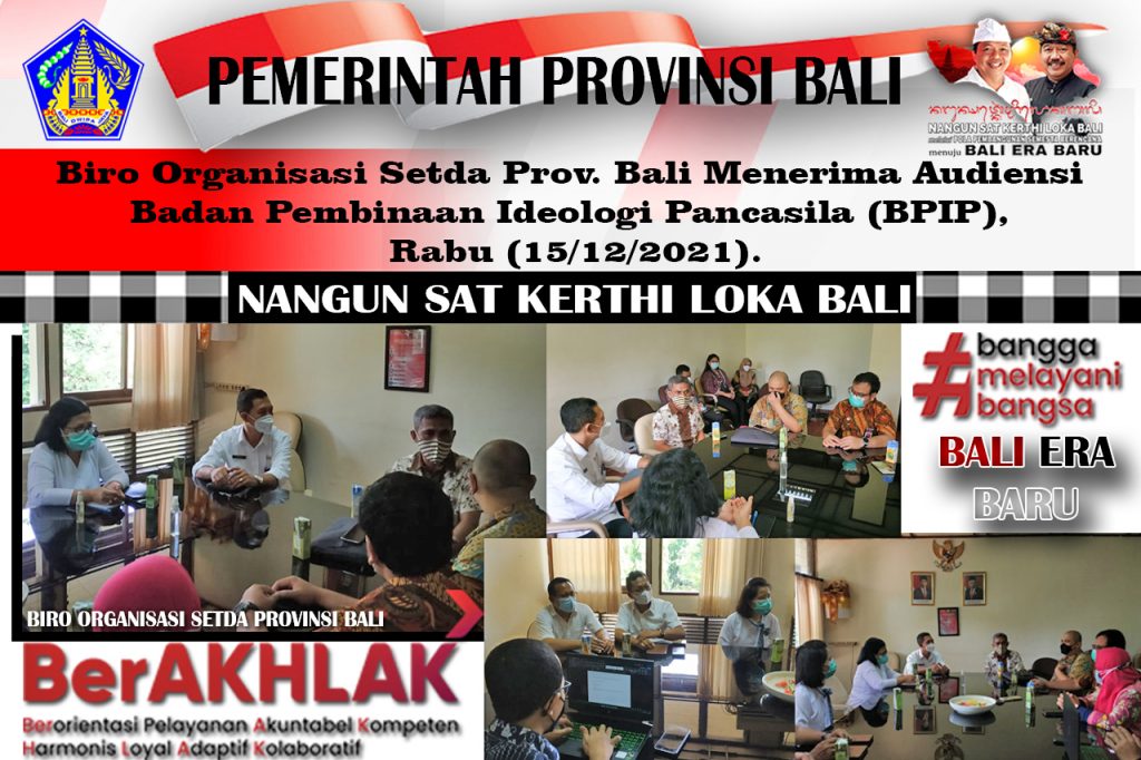 Dalam rangka optimalisasi pelaksanaan reformasi birokrasi di lingkungan Badan Pembinaan Ideologi Pancasila (BPIP) khususnya pada area perubahan pelayanan publik, maka pada hari Rabu (15/12/2021) BPIP melaksanakan audiensi ke Biro Organisasi Setda Provinsi Bali berkaitan dengan proses pembentukan peraturan survei kepuasan masyarakat yang telah dilakukan Pemerintah Provinsi Bali.