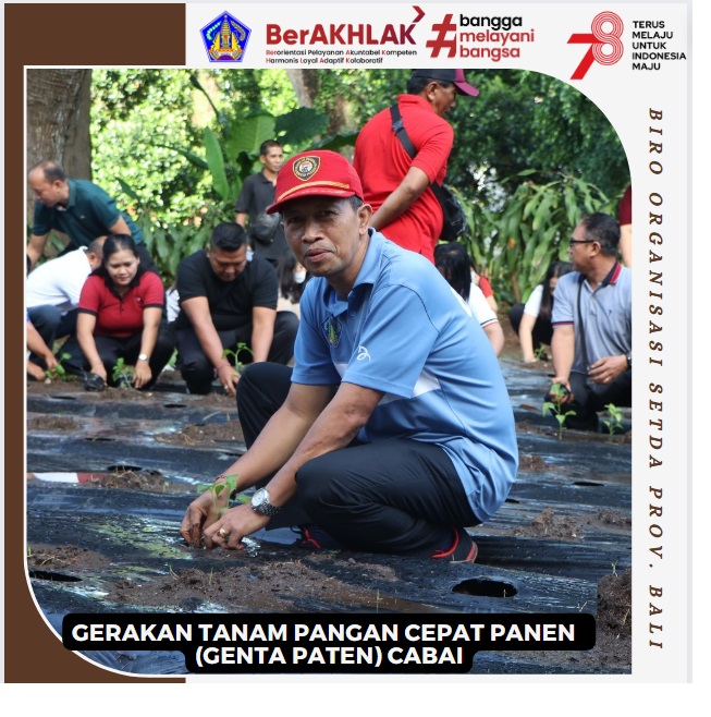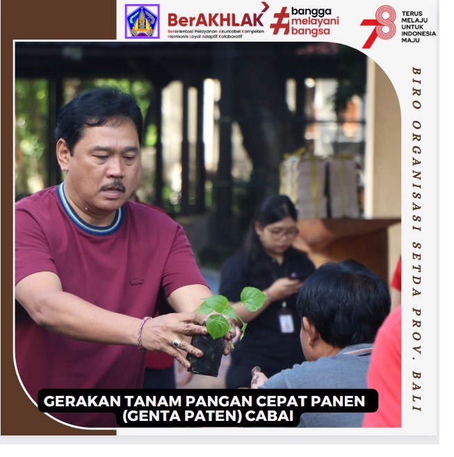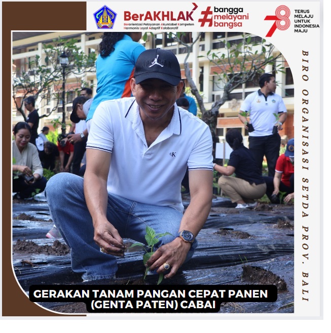 Menindaklanjuti Surat Edaran Gubernur Bali Nomor 6 Tahun 2024 tentang Gerakan Tanam Pangan Cepat Panen Mendukung Pengendalian Inflasi di provinsi Bali, maka dilaksanakan Gerakan Tanam Pangan Cepat Panen (GENTA PATEN) Cabai pada masing-masing Perangkat Daerah di lingkungan Pemerintah Provinsi Bali serentak pada hari Jumat tanggal 5 April 2024
