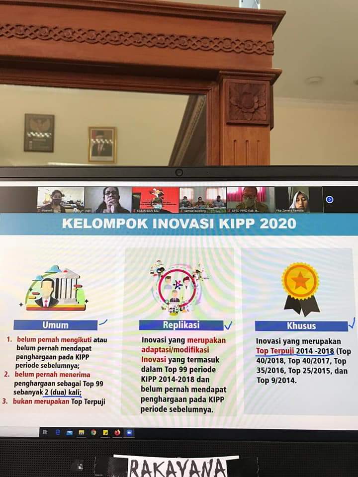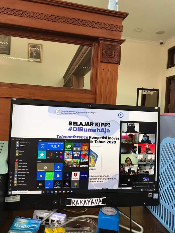 Sosialisasi/bimbingan teknis melalui teleconference dalam rangka Kompetisi Inovasi Pelayanan Publik Tahun 2020 dengan memperhatikan Surat Edaran Menpan RB Nomor 19 Tahun 2020 tentang penyesuaian sistem kerja aparatur sipil negara dalam upaya pencegahan COVID-19 di lingkungan Instansi Pemerintah. Kementerian PAN RB mempasilitasi e-learning berupa bahan paparan dan vidio pembelajaran mengenai kebijakan dan teknis pelaksanaan KIPP Tahun 2020 yang diikuti oleh Badan Pendapatan Daerah PRovinsi Bali dengan 2 (dua) UPTD PPRD jembrana dan Buleleng, Badan Riset dan Inovasi Provinsi Bali, Dinas Kebudayaan Provinsi Bali, Inspektorat, dan Rumah Sakit Mata Bali Mandara untuk kelompok umum sedangkan kelompok khusus diundang 2 (dua) peserta yaitu RS Mata Bali Mandara dan SMA Bali Mandara dan Biro Organisasi Setda Provinsi Bali sebagai Admin Lokal KIPP Provinsi Bali