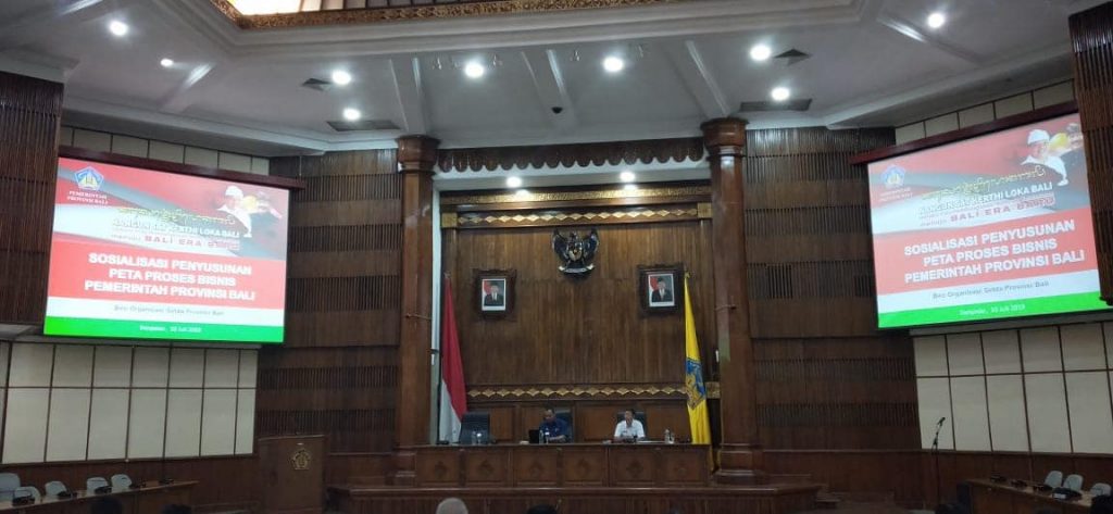 Menindaklanjuti PermenPAN RB No 19 Tahun 2018 tentang Penyusunan Peta Proses Bisnis Instansi Pemerintah, Biro Organisasi Setda Provinsi Bali melaksanakan Sosialisasi Penyusunan Peta Proses Bisnis yang di pimpin oleh Bapak I Wayan Serinah, S.Sos.,M.Si (Kepala Biro Organisasi Setda Provinsi Bali) dengan mengundang Narasumber dari Kementerian PAN RB, Bapak M. Iqbal Budianto, S.Kom., M.E.Biz (Kasubid Evaluasi Kebijakan Kelembagaan) pada hari Rabu tanggal 10 Juli 2019 pukul 10.00 Wita bertempat di Gedung Wiswa Sabha Utama Kantor Gubernur Bali di hadiri oleh seluruh Perangkat Daerah Pemerintah Provinsi Bali dan Bagian Organisasi Kab/kota Se Bali.